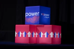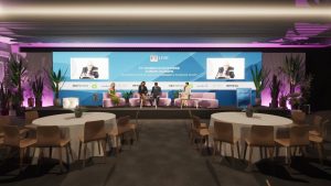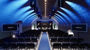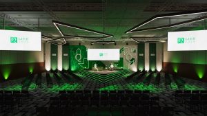Stage backdrop with integrated LED screens, branded lectern, and light cube