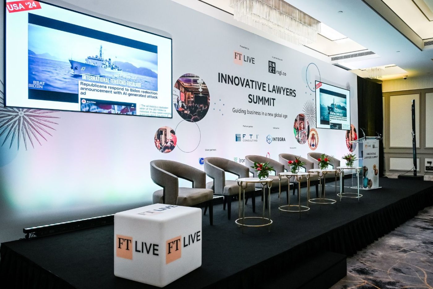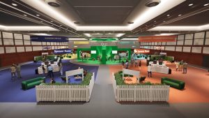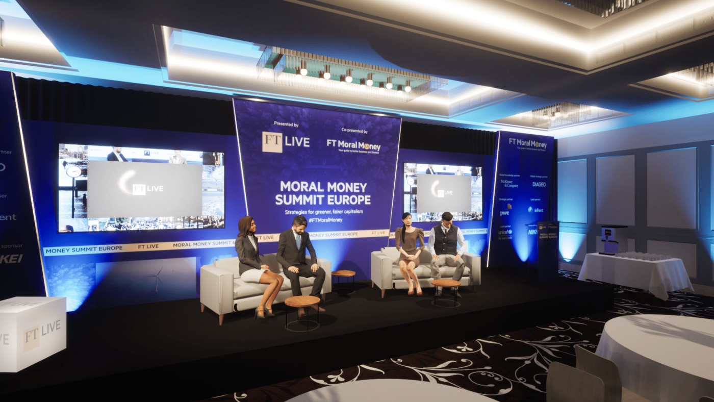 For the Financial Times event, we created a 3D render showcasing a custom stage design built around a large central LED screen for branded content and event assets. Additional screens were positioned throughout the space to visualise how content would be experienced across the room.