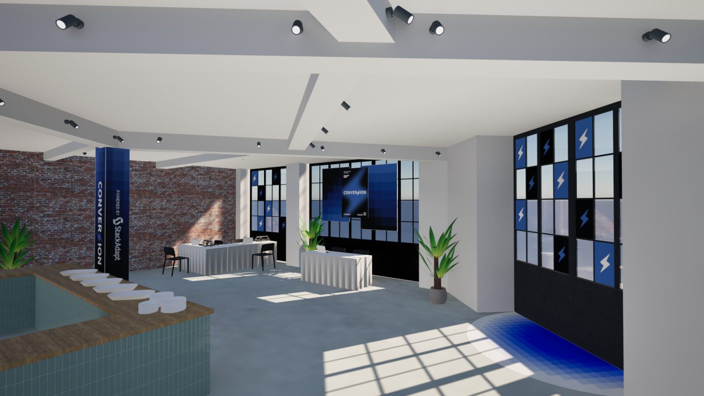 For the StackAdapt Conversion event, we worked with a versatile venue, utilising a variety of different spaces. We showcased all the branding elements within the 3D render, including custom window vinyls, wall decals, neon signage and stage and furniture design to fully visualise the event.