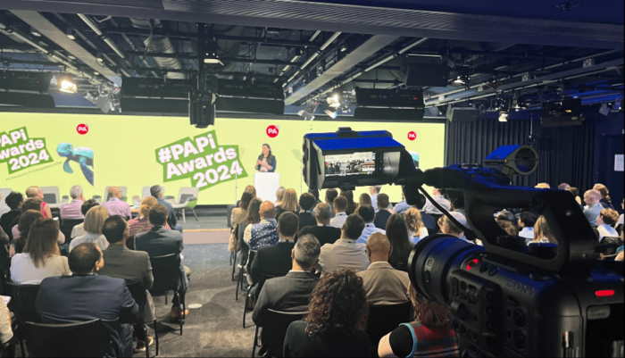 PA Consulting chose this option for their 2024 PAPi awards. The backdrop you can see here is an LED wall, which allowed for a range of backgrounds throughout the event, as well as videos, and presentations. It created a really engaging stage design and is fully reusable.