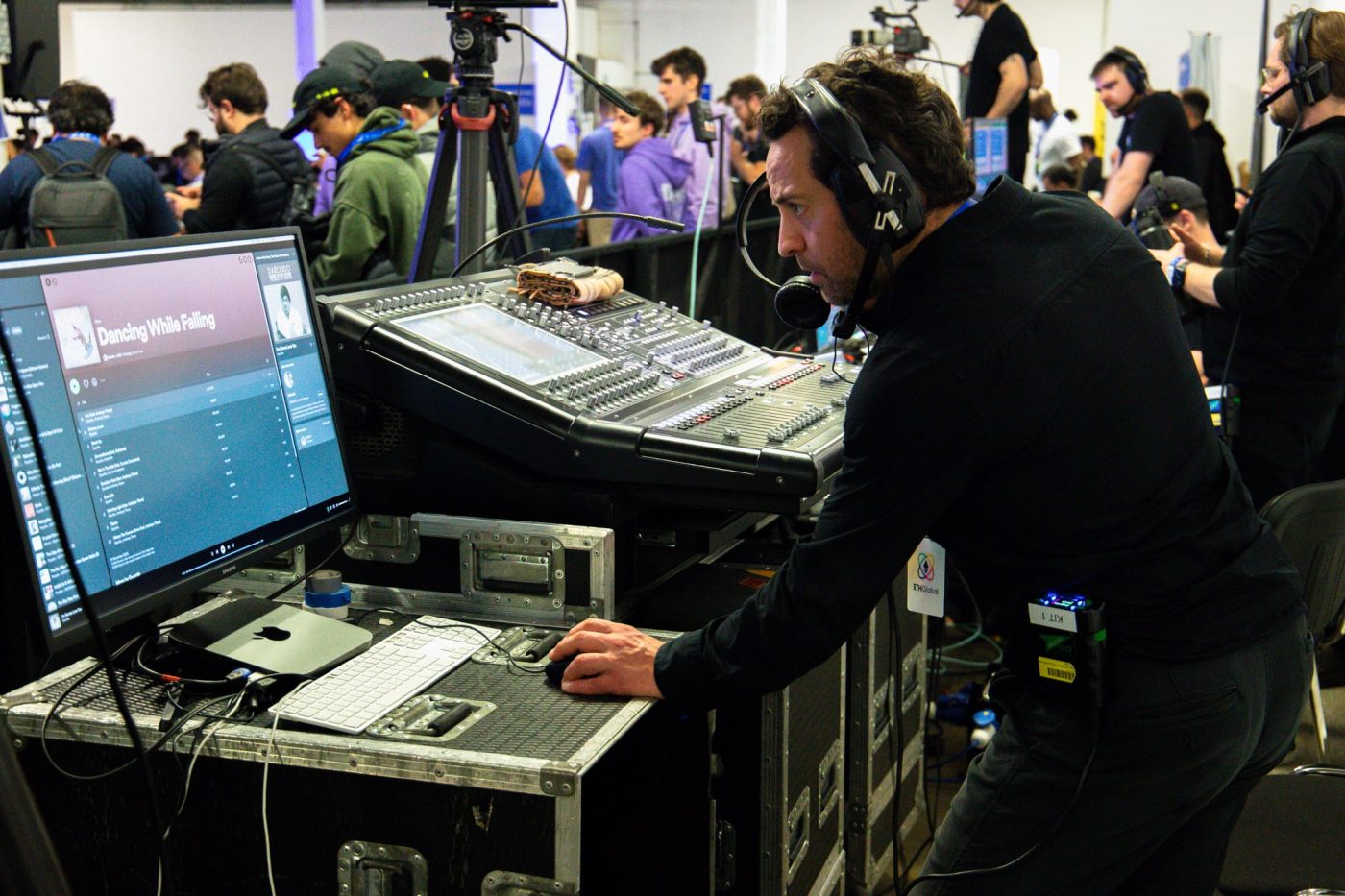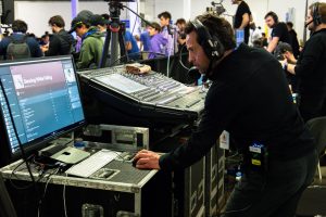To have as much redundancy as possible, we covered each AV capacity with individual operators to ensure we were appropriately staffed to mitigate any staff or technical difficulties and allow us to be responsive to any last-minute requests from the client. Our AV team for the main stage included two Sound Engineers, two Lighting Engineers, two Video Engineers, a Live Stream Engineer, a Timer Operator, a Show Caller, Stage Management, and two Camera Operators operating three cameras. We also had a Producer for the main room, in addition to an event Project Manager, to ensure the main room was operational while the rest of the venue was being set up.