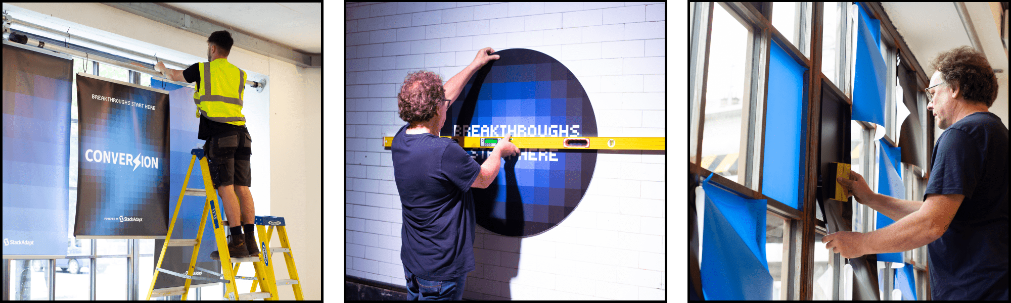 Working alongside our creative partners at Scenic Escape, we produced a suite of bespoke branded elements tailored to the industrial charm of Kachette, East London. These included wall vinyls, a large floor vinyl strip emulating a carpet runner, hanging branded panels, way finding blocks, LED logo cubes, window vinyls, branded flag poles, and even custom cushions — all designed to incorporate the StackAdapt identity throughout the whole venue.