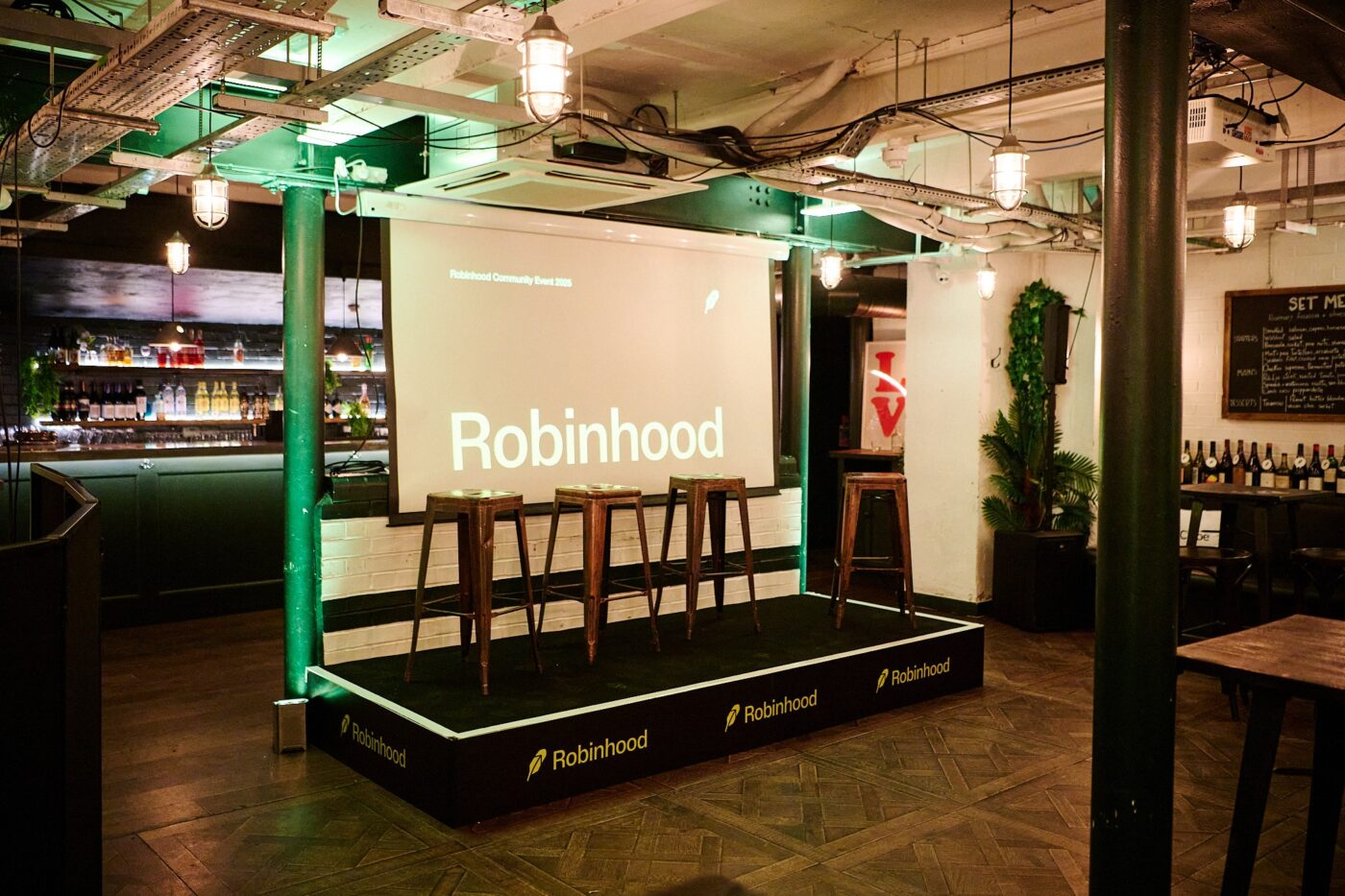 We worked with Robinhood to produce an exclusive customer event to launch their stock trading and investment app in the UK. The event was held over two floors of Fare bar and restaurant in London, and featured key discussions, live music, engagement with the leadership team at Robinhood, panel discussions and a live product demo. For the event, we created custom branding for the two floors, designed and built a stage, took event photography, and provided AV support