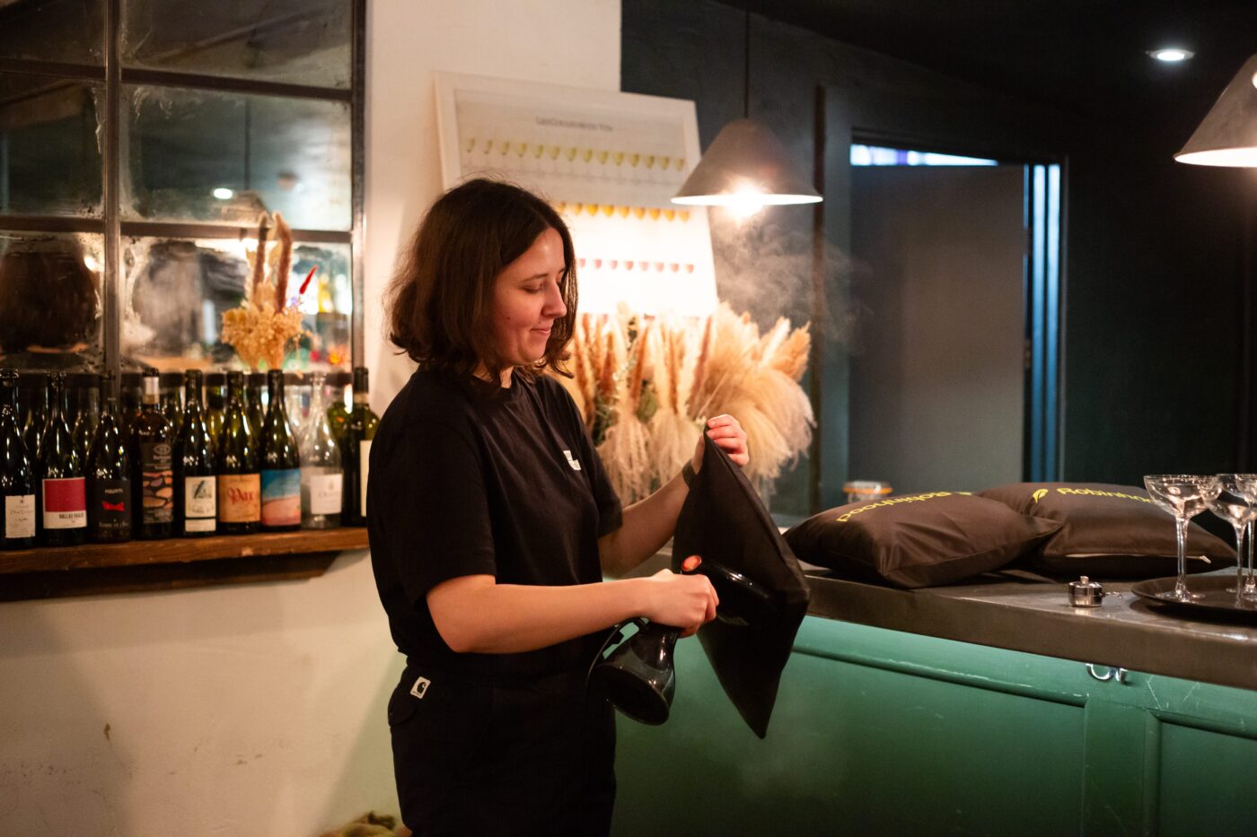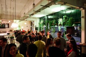 Interior shot of the event branding launch event for Robinhood, a branded agenda menu sits ontop of the bar in the venue
